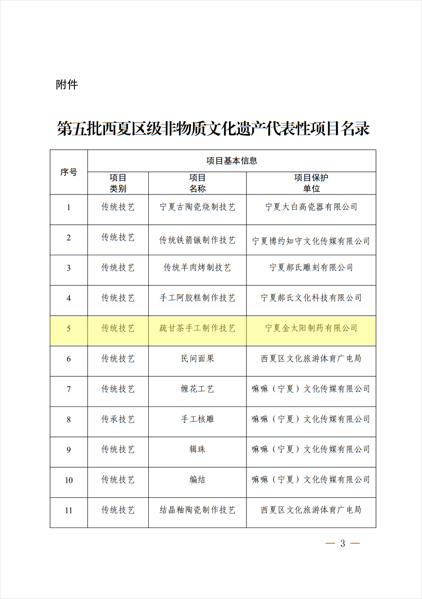 寧夏金太陽藥業有限公司出品的“疏甘茶”,其手工制作技藝經銀川市西夏區人民政府、銀川市西夏區文化旅游體育廣電局評審,被列入第五批西夏區級非物質文化遺產代表性項目名錄。